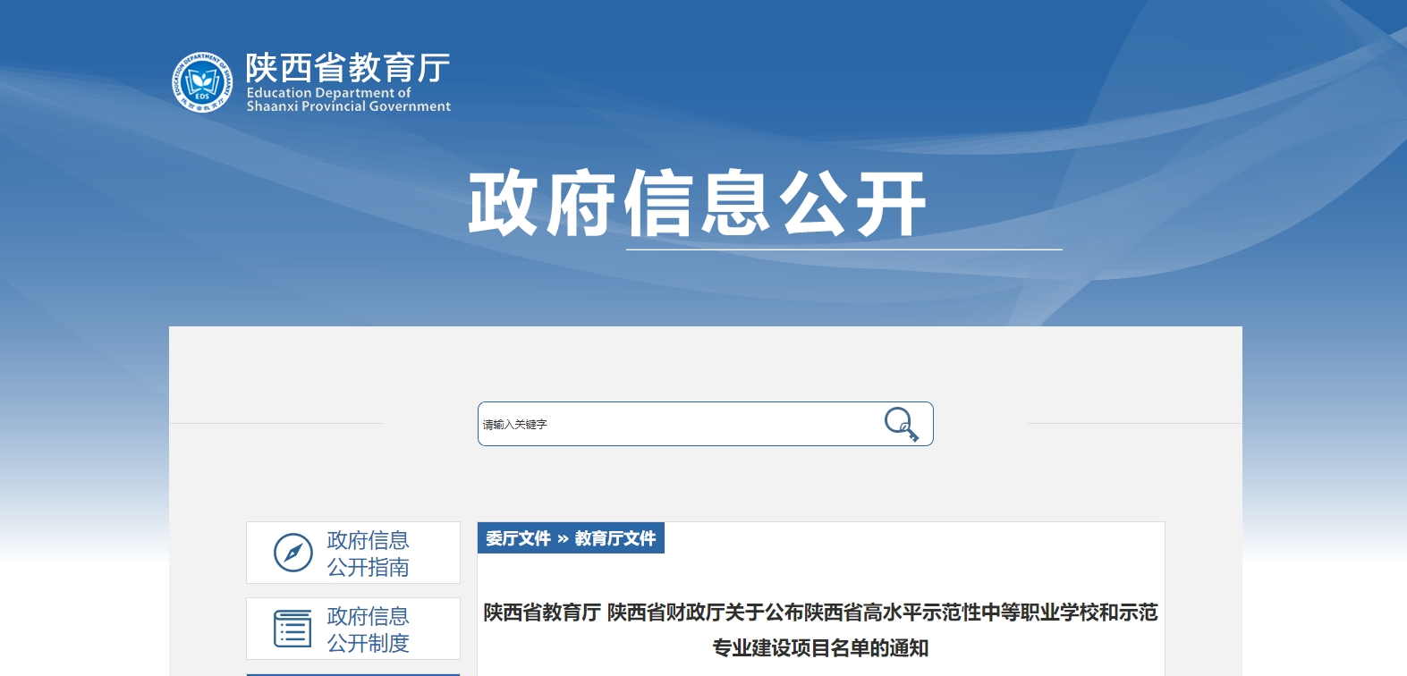 近日,陜西省教育廳、陜西省財政廳發(fā)布陜西省高水平示范性中等職業(yè)學(xué)校和示范專業(yè)建設(shè)項目名單的通知,將50所陜西省高水平示范性中等職業(yè)學(xué)校和150個示范專業(yè)建設(shè)項目(以下簡稱“雙示范”建設(shè)項目)名單予以公布。