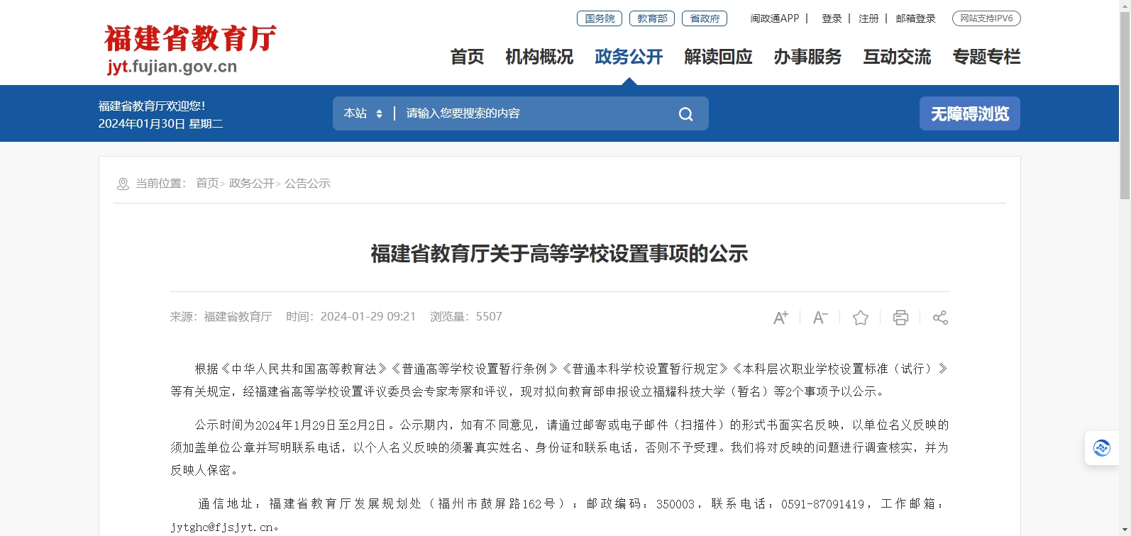 2024年1月29日,福建省教育廳官方網(wǎng)站發(fā)布《福建省教育廳關(guān)于高等學(xué)校設(shè)置事項(xiàng)的公示》。公示中稱(chēng),根據(jù)《中華人民共和國(guó)高等教育法》《普通高等學(xué)校設(shè)置暫行條例》《普通本科學(xué)校設(shè)置暫行規(guī)定》《本科層次職業(yè)學(xué)校設(shè)置標(biāo)準(zhǔn)(試行)》等有關(guān)規(guī)定,經(jīng)福建省高等學(xué)校設(shè)置評(píng)議委員會(huì)專(zhuān)家考察和評(píng)議,現(xiàn)對(duì)擬向教育部申報(bào)設(shè)立福耀科技大學(xué)(暫名)等2個(gè)事項(xiàng)予以公示。