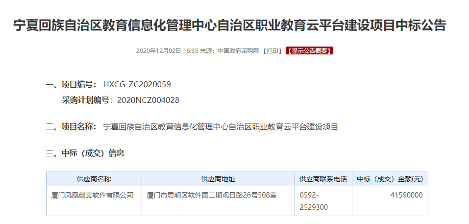 4159萬元!鳳凰創(chuàng)壹中標(biāo)寧夏職業(yè)教育云平臺項(xiàng)目