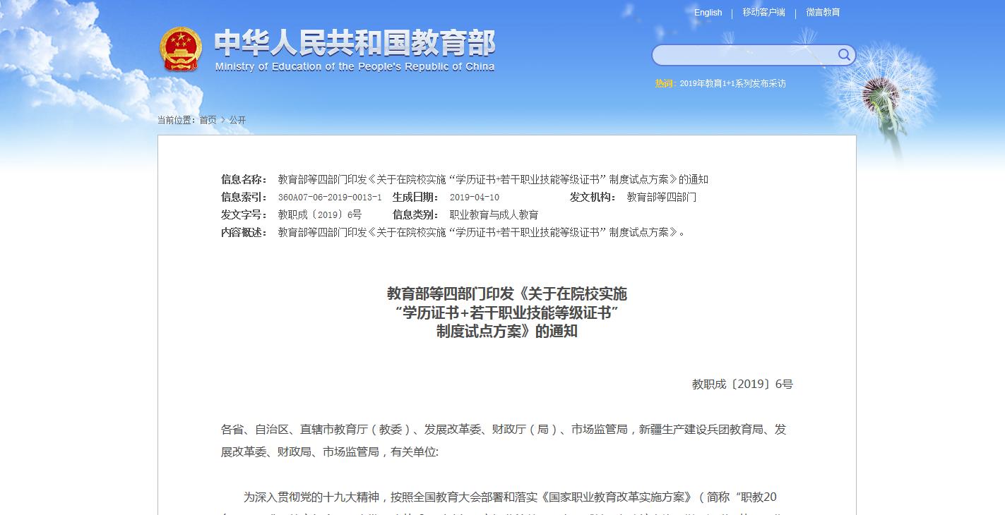 4月12日,教育部職業(yè)教育與成人教育司在教育部官網(wǎng)發(fā)布關(guān)于印發(fā)《職業(yè)教育與繼續(xù)教育2019年工作要點(diǎn)》的函,《要點(diǎn)》對(duì)完善中等和高等職業(yè)教育和培訓(xùn)體系,校企合作、產(chǎn)教融合,加快高水平院校和專業(yè)建設(shè)等方......