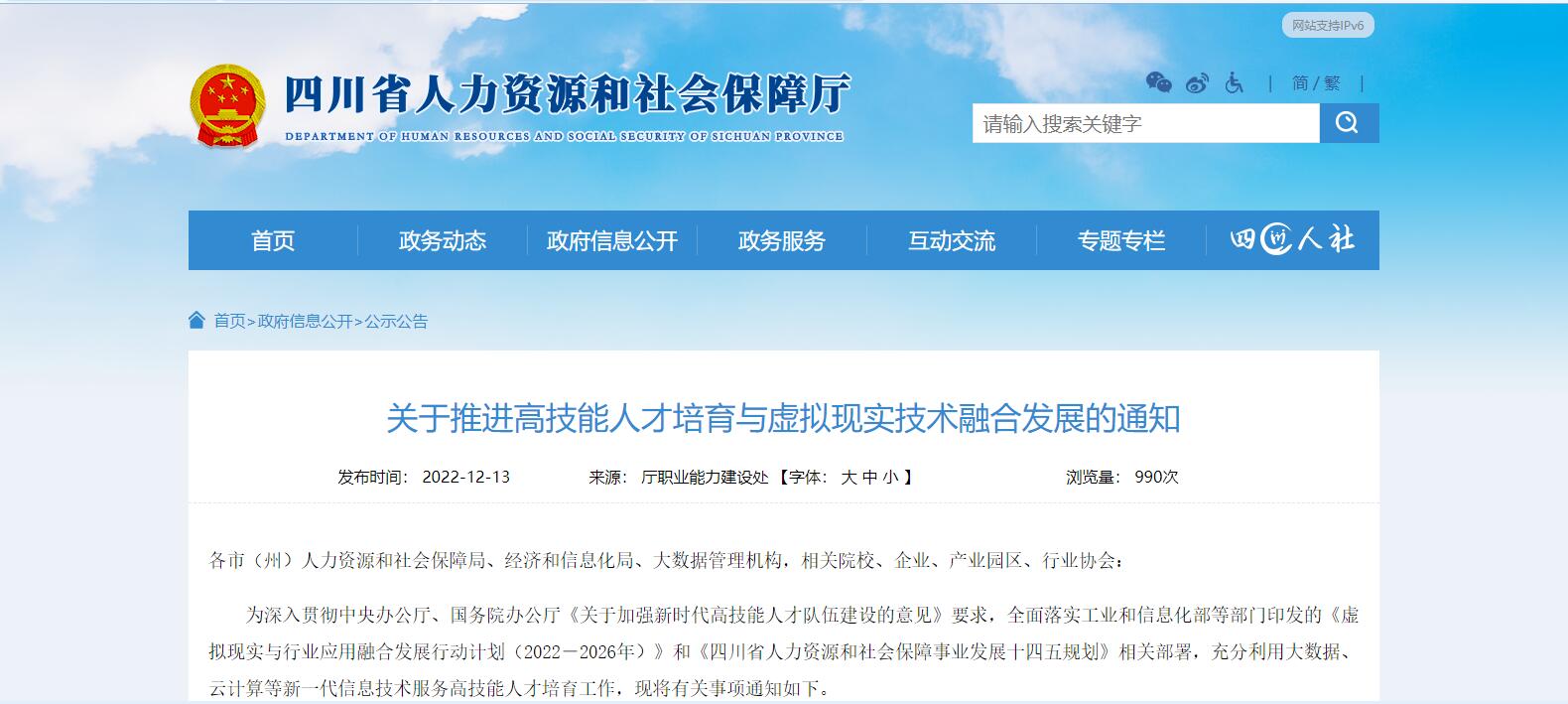 四川省人社廳等3部門聯(lián)合印發(fā)《關(guān)于推進高技能人才培育與虛擬現(xiàn)實技術(shù)融合發(fā)展的通知》