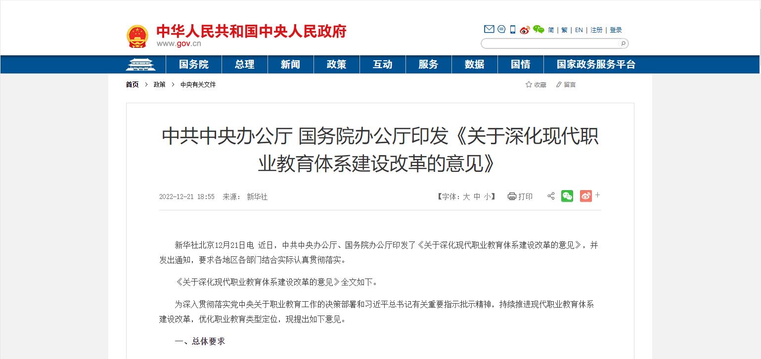 國務(wù)院印發(fā)《關(guān)于深化現(xiàn)代職業(yè)教育體系建設(shè)改革的意見》