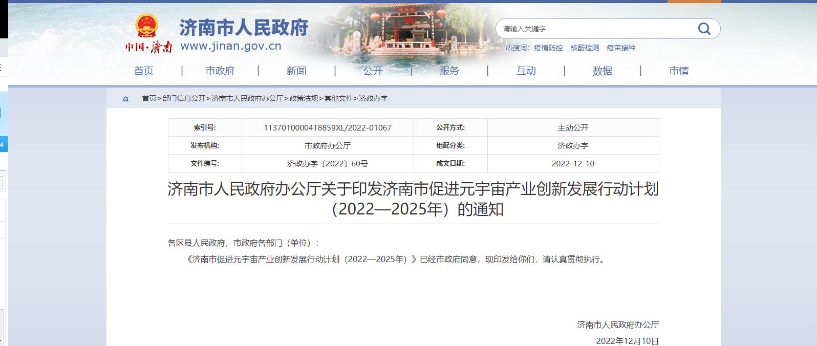 濟(jì)南市政府12月10日發(fā)布《濟(jì)南市促進(jìn)元宇宙產(chǎn)業(yè)創(chuàng)新發(fā)展行動(dòng)計(jì)劃(2022—2025年)》。山東省濟(jì)南市政府12月10日發(fā)布《濟(jì)南市促進(jìn)元宇宙產(chǎn)業(yè)創(chuàng)新發(fā)展行動(dòng)計(jì)劃(2022—2025年)》(以下簡(jiǎn)稱(chēng)《......