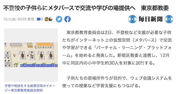 據(jù)《每日新聞》等日媒報道,東京都教育委員會12月2日宣布,為了幫助厭學(xué)兒童,將通過元宇宙平臺幫助他們進行日常學(xué)習(xí)和交流。東京都教委將和新宿區(qū)教委合作,在12月以新宿區(qū)大約30名中小學(xué)生為對象先進行試運......