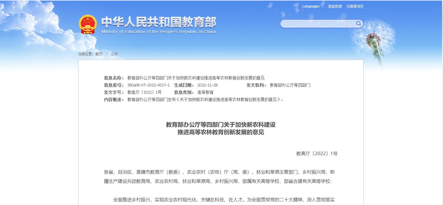 教育部辦公廳等四部門關(guān)于加快新農(nóng)科建設(shè)推進高等農(nóng)林教育創(chuàng)新發(fā)展的意見